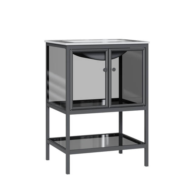Тумба для ванної темноісірого кольору, з прозорими сірими скляними дверцятами..